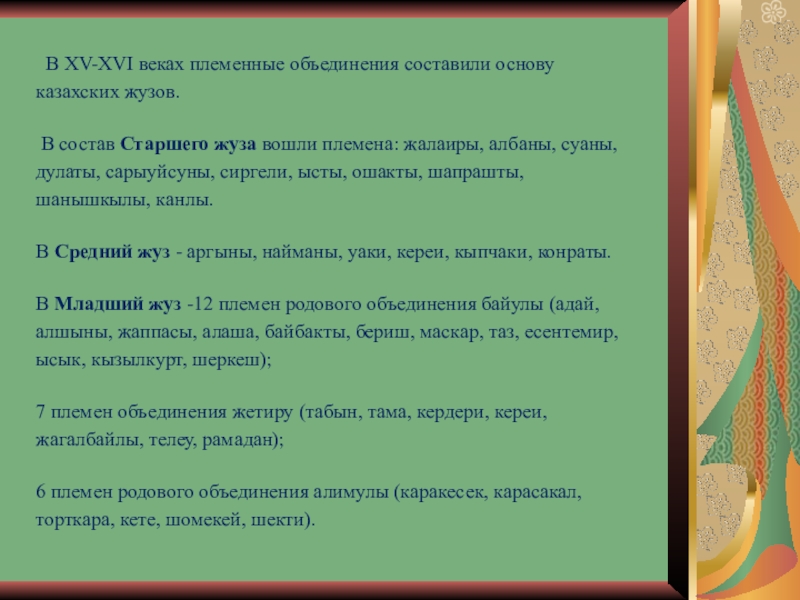 Слайд 25 В XV-XVI веках племенные объединения составили основу казахских жузов.