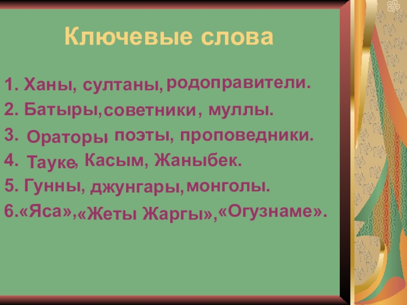7. Ханство состояло из трех жузов. Повелителем ханства являлся великий хан.