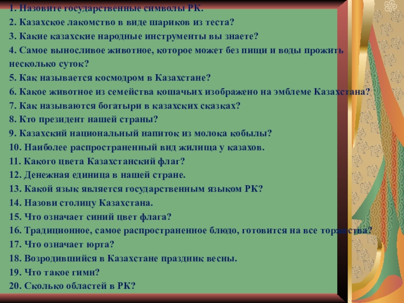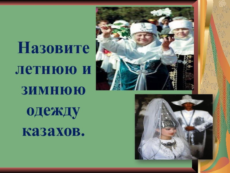 Слайд 34Назовите летнюю и зимнюю одежду казахов.