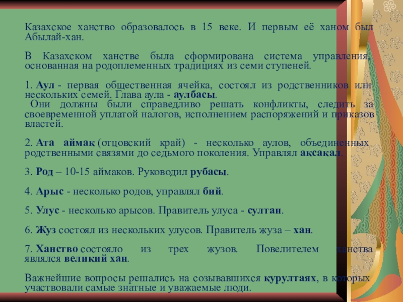 В Казахском ханстве была сформирована система управления, основанная на родоплеменных традициях из семи ступеней.