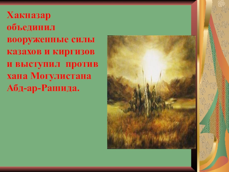 Слайд 28Хакназар объединил вооруженные силы казахов и киргизов и выступил против хана