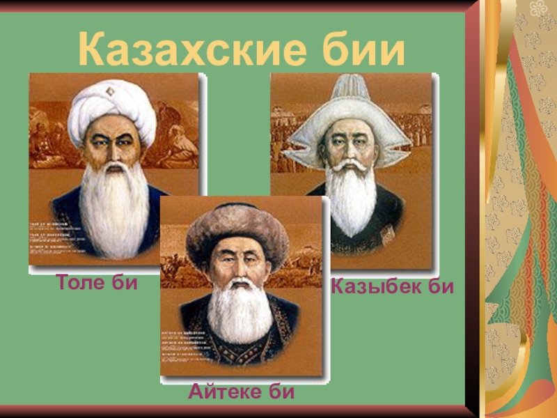 Слайд 26Бии, которые помогали управлять хану Тауке, а также разработали свод законов