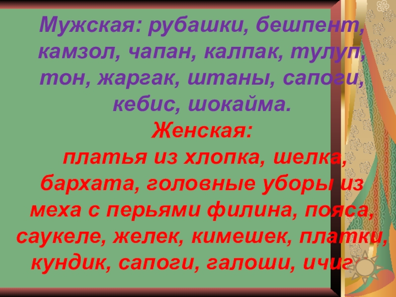 Слайд 35Мужская: рубашки, бешпент, камзол, чапан, калпак, тулуп, тон, жаргак, штаны, сапоги,кебис,