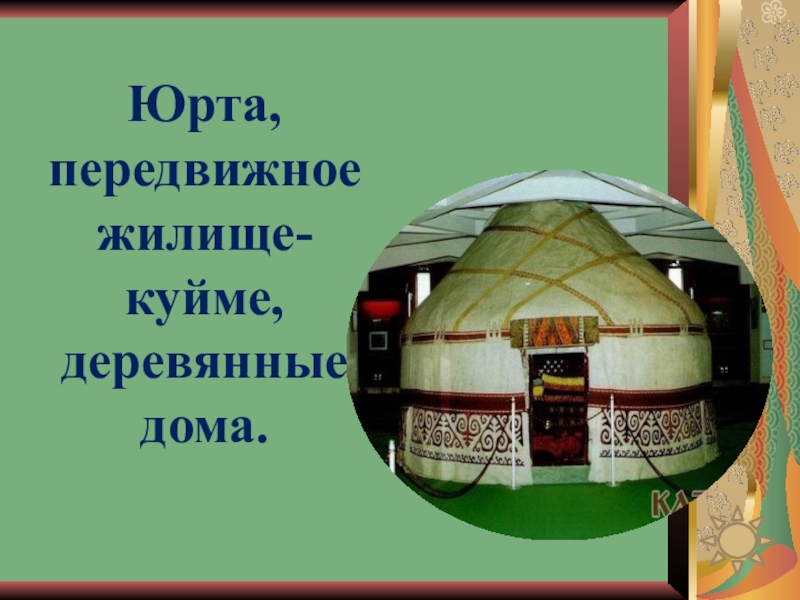 Слайд 33Юрта, передвижное жилище-куйме, деревянные дома.