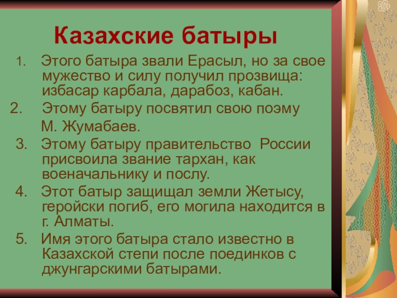 4. Этот батыр защищал земли Жетысу, геройски погиб, его могила находится в г. Алматы.