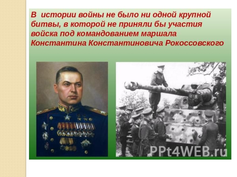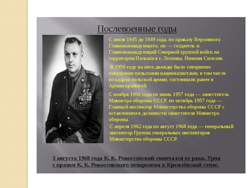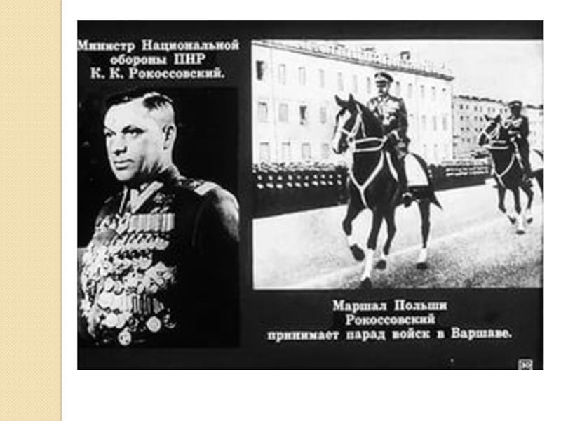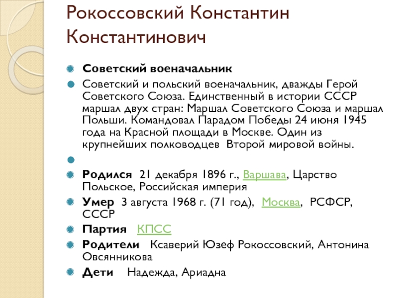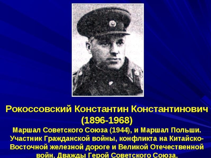 Единственный в истории СССР маршал двух стран: Маршал Советского Союза и маршал Польши. Командовал Парадом Победы 24 июня 1945 года на Красной площади в Москве. Один из крупнейших полководцев Второй мировой войны.