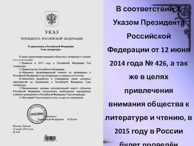 года № 426, а так же в целях привлечения внимания общества к литературе и чтению, в 2015 году в России будет проведён