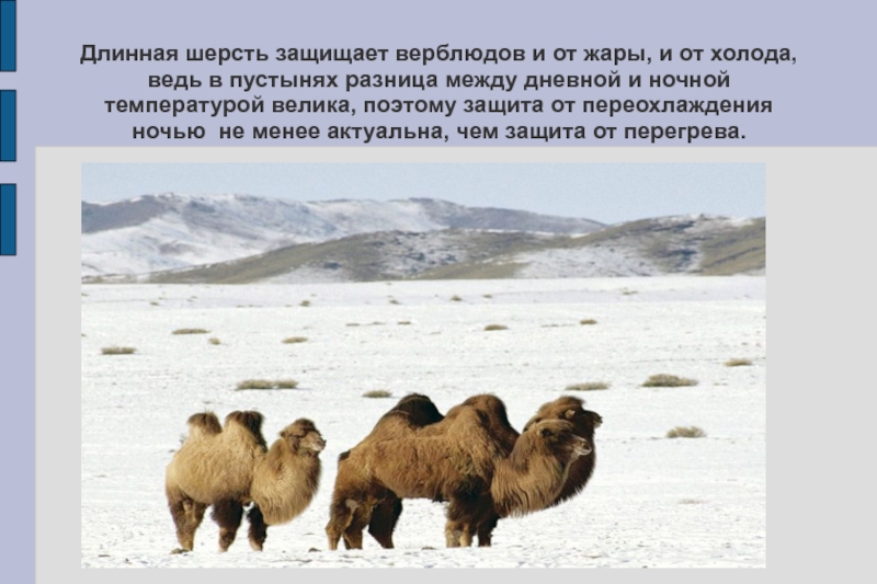 Слайд 4Длинная шерсть защищает верблюдов и от жары, и от холода, ведь