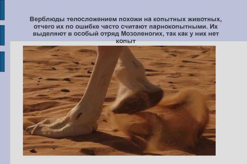 Верблюды телосложением похожи на копытных животных, отчего их по ошибке часто считают парнокопытными. Их выделяют в особый отряд Мозоленогих, так как у них нет копыт