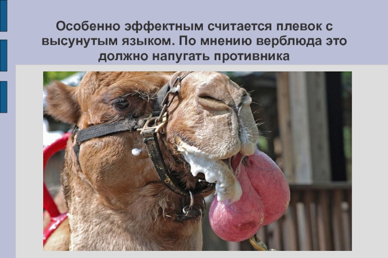 Слайд 8Особенно эффектным считается плевок с высунутым языком. По мнению верблюда это
