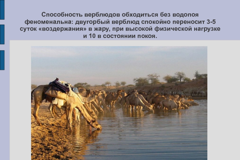 Слайд 5Способность верблюдов обходиться без водопоя феноменальна: двугорбый верблюд спокойно переносит 3-5