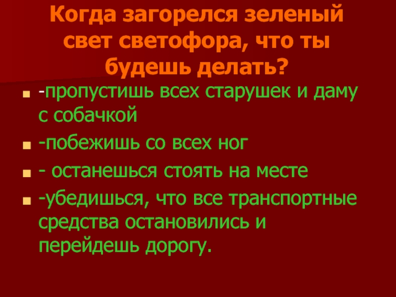 Когда загорелся зеленый свет светофора, что ты будешь делать? -пропустишь всех старушек и даму с собачкой-побежишь со