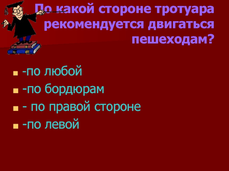 Слайд 5По какой стороне тротуара рекомендуется двигаться пешеходам?