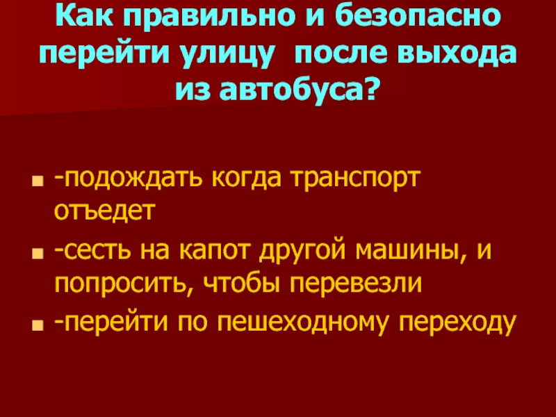 Как правильно и безопасно перейти улицу после выхода из автобуса?-подождать когда транспорт отъедет -сесть на капот другой