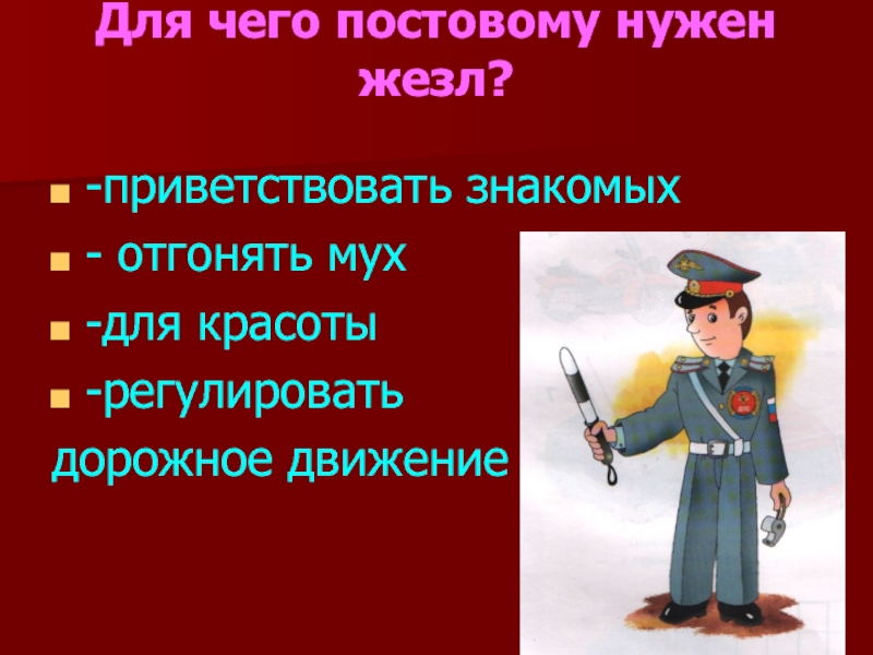 Для чего постовому нужен жезл? -приветствовать знакомых- отгонять мух-для красоты-регулироватьдорожное движение