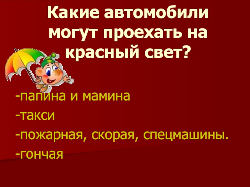 Какие автомобили могут проехать на красный свет?-папина и мамина-такси-пожарная, скорая, спецмашины.-гончая