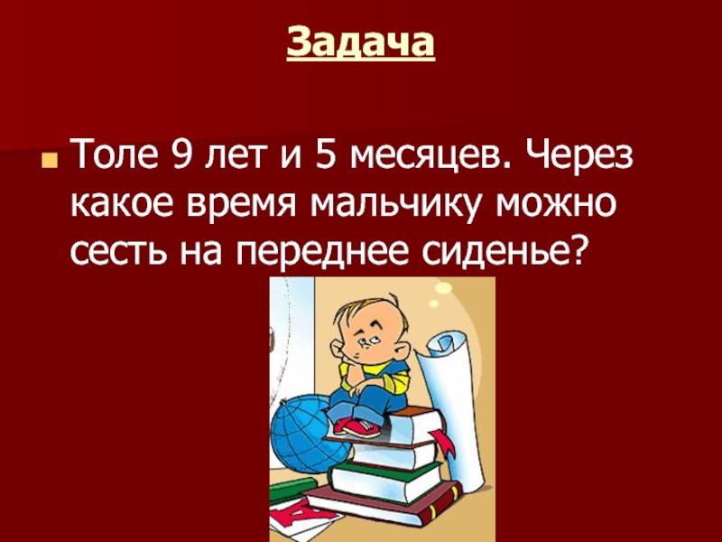 Задача Толе 9 лет и 5 месяцев. Через какое время мальчику можно сесть на переднее сиденье?