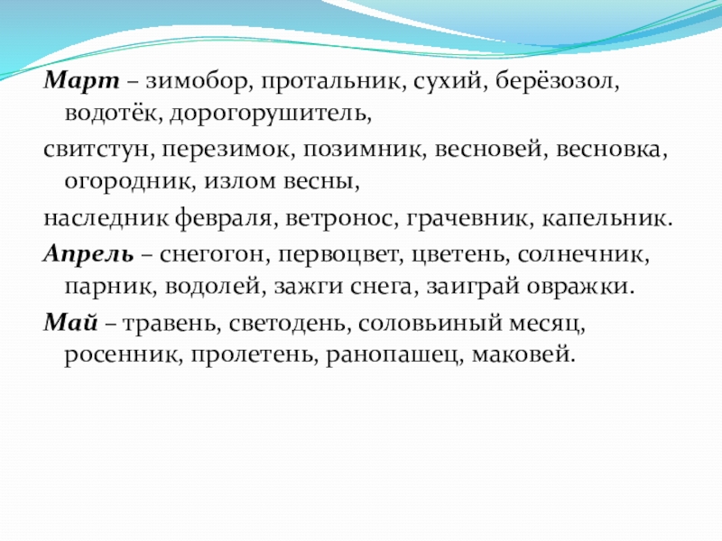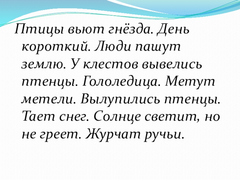 птенцы. Гололедица. Метут метели. Вылупились птенцы. Тает снег. Солнце светит, но не греет. Журчат ручьи.