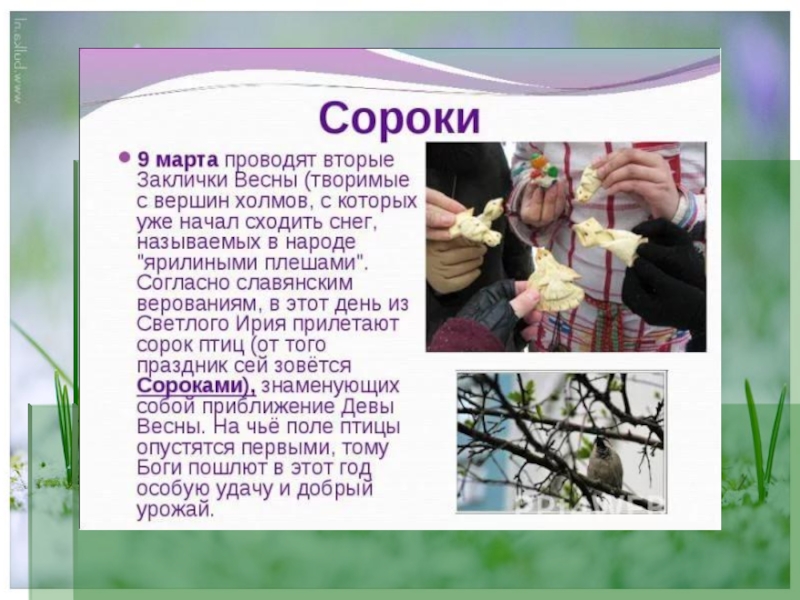Готовили обрядовое печенье в виде птиц - «жаворонков». Дети брали испеченного «жаворонка», шли в поле, подбрасывали его в воздух, ловили, приговаривая: