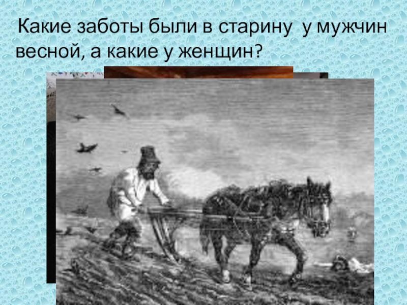 Слайд 4 Какие заботы были в старину у мужчин весной, а какие