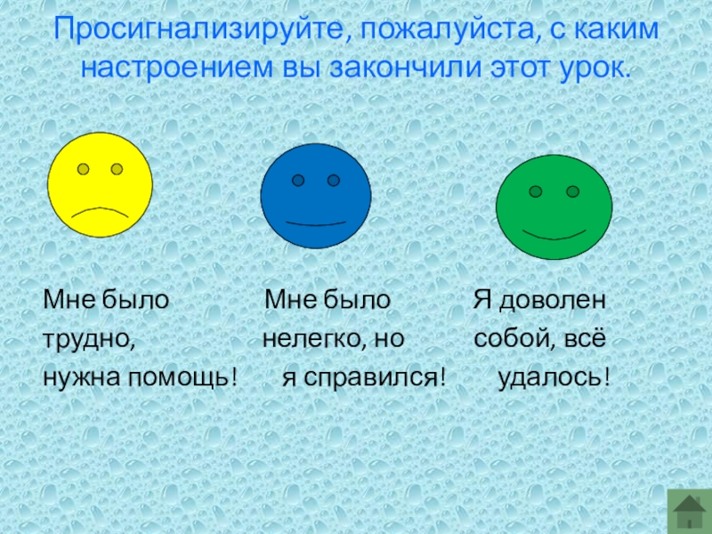 Просигнализируйте, пожалуйста, с каким настроением вы закончили этот урок.   Мне было