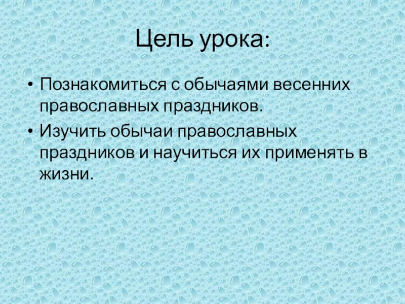 Цель урока:Познакомиться с обычаями весенних православных праздников.Изучить обычаи православных праздников и научиться их применять в жизни.