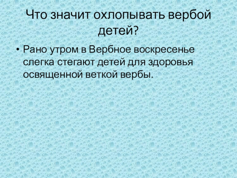 Что значит охлопывать вербой детей? Рано утром в Вербное воскресенье слегка стегают детей для здоровья освященной веткой