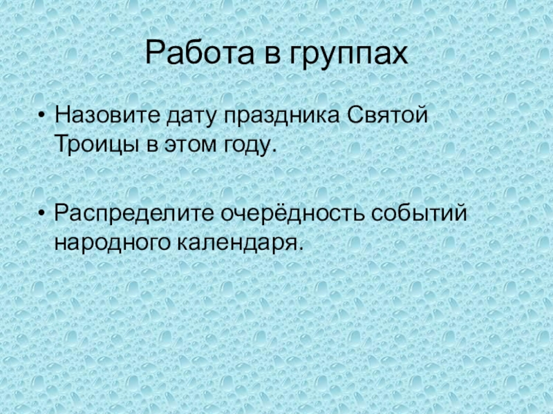 Работа в группахНазовите дату праздника Святой Троицы в этом году.Распределите очерёдность событий народного календаря.
