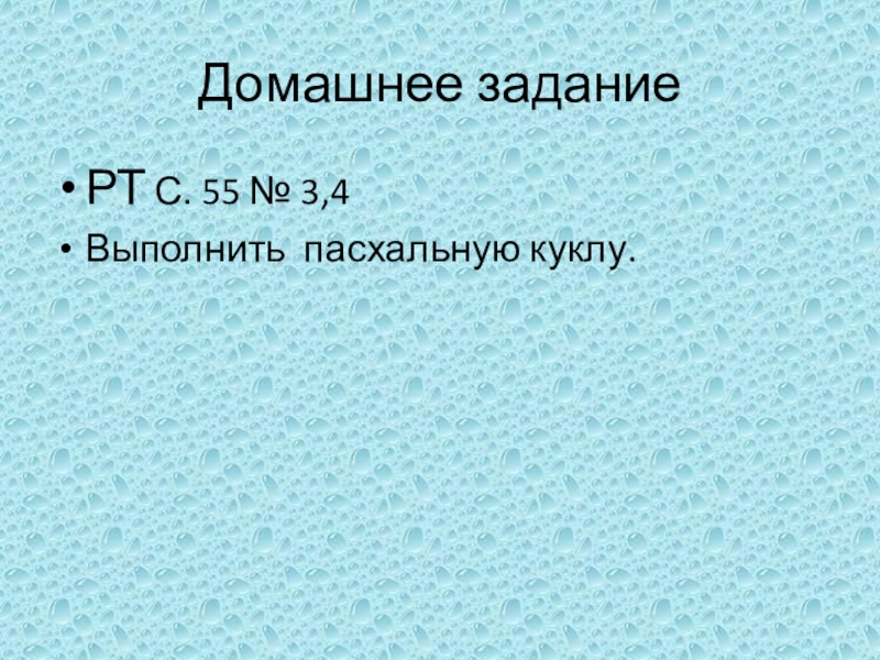Домашнее заданиеРТ С. 55 № 3,4Выполнить пасхальную куклу.