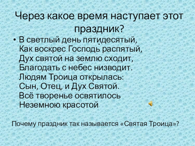 Через какое время наступает этот праздник? . В светлый день пятидесятый, Как воскрес Господь распятый, Дух святой