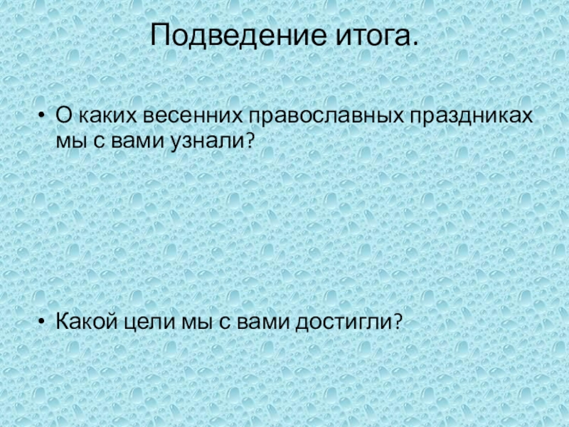 Подведение итога. О каких весенних православных праздниках мы с вами узнали?Какой цели мы с вами достигли?