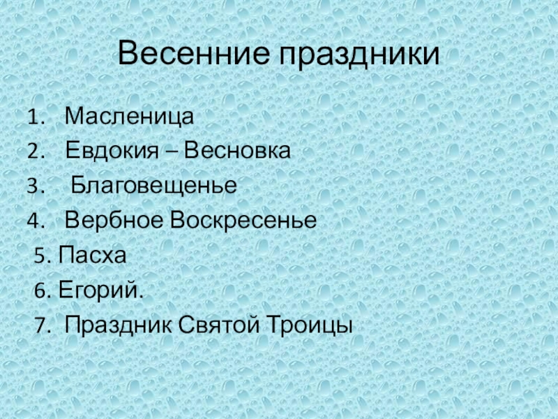 Весенние праздники МасленицаЕвдокия – Весновка Благовещенье Вербное Воскресенье 5. Пасха 6. Егорий.7. Праздник Святой Троицы