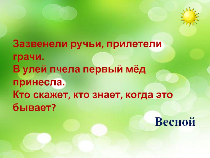 Зазвенели ручьи, прилетели грачи. В улей пчела первый мёд принесла. Кто скажет, кто знает, когда это бывает? Весной