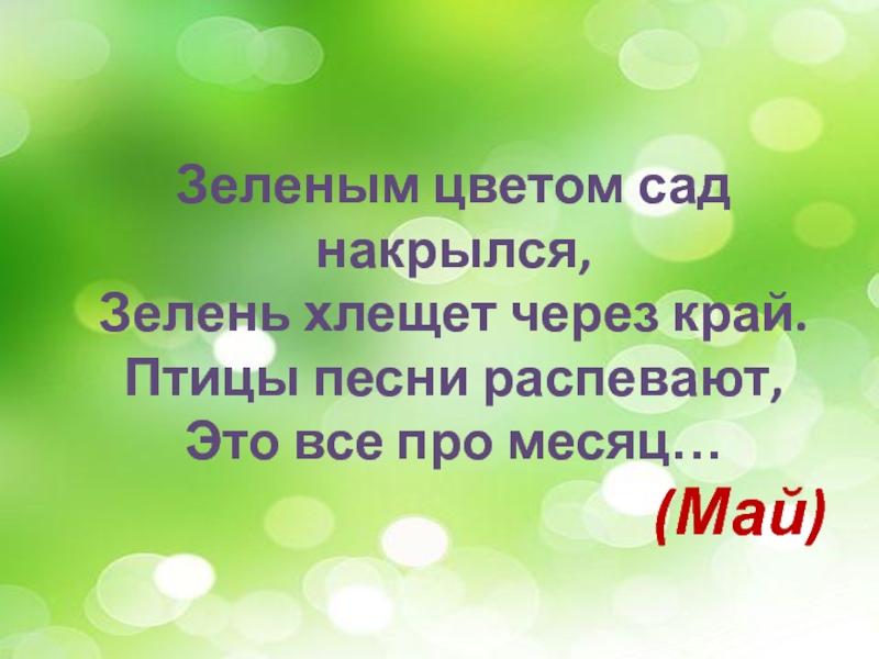 Зеленым цветом сад накрылся, Зелень хлещет через край. Птицы песни распевают, Это все про месяц… (Май)