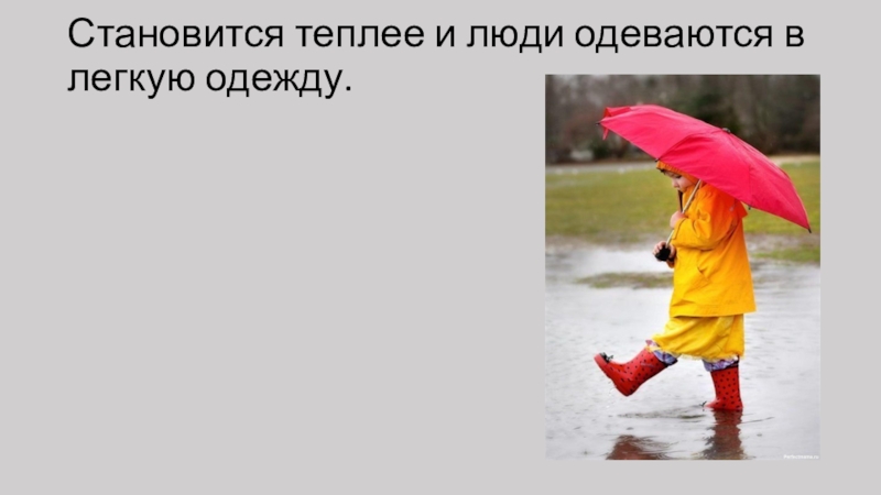 Слайд 14Становится теплее и люди одеваются в легкую одежду.
