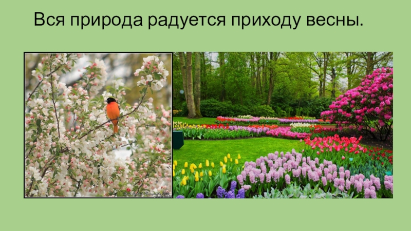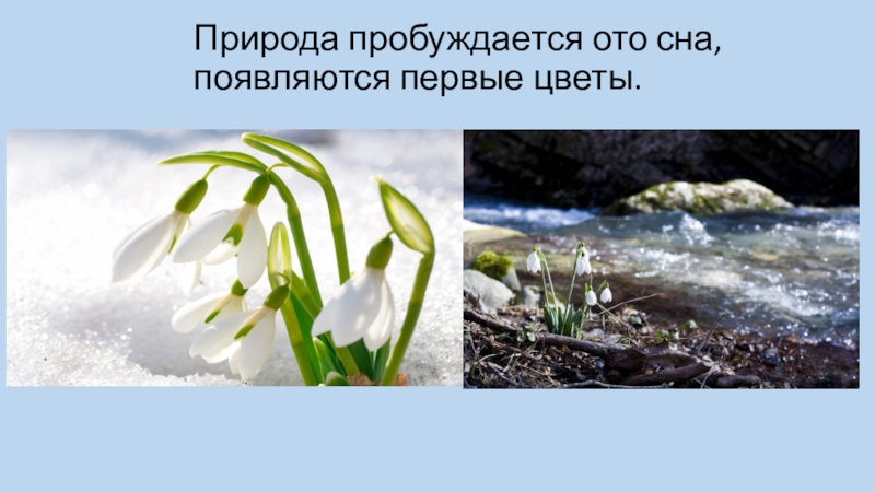 Слайд 7Природа пробуждается ото сна, появляются первые цветы.