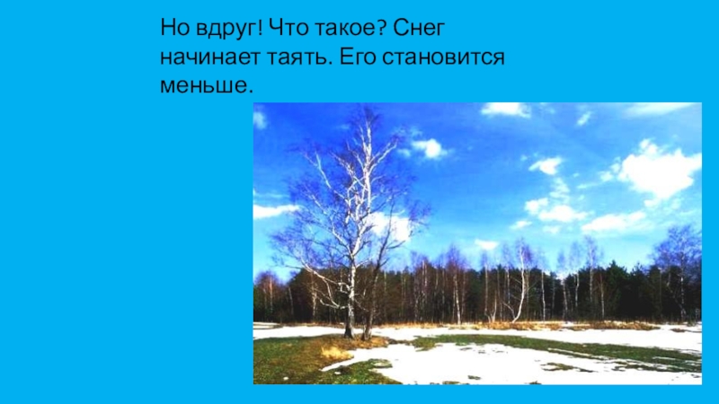 Слайд 2Но вдруг! Что такое? Снег начинает таять. Его становится меньше.