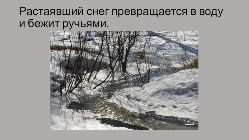 Слайд 6Растаявший снег превращается в воду и бежит ручьями.