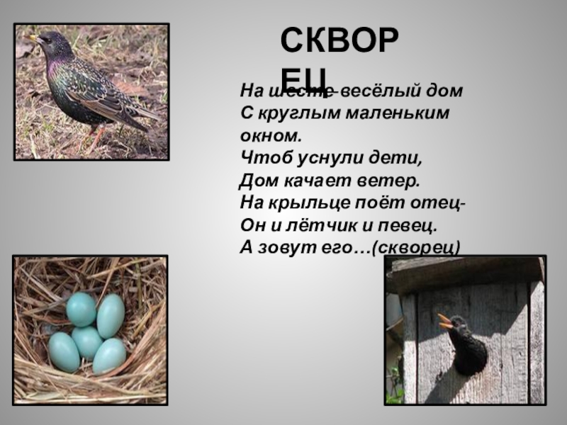 СКВОРЕЦНа шесте-весёлый домС круглым маленьким окном.Чтоб уснули дети,Дом качает ветер.На крыльце поёт отец-Он и лётчик и певец.А