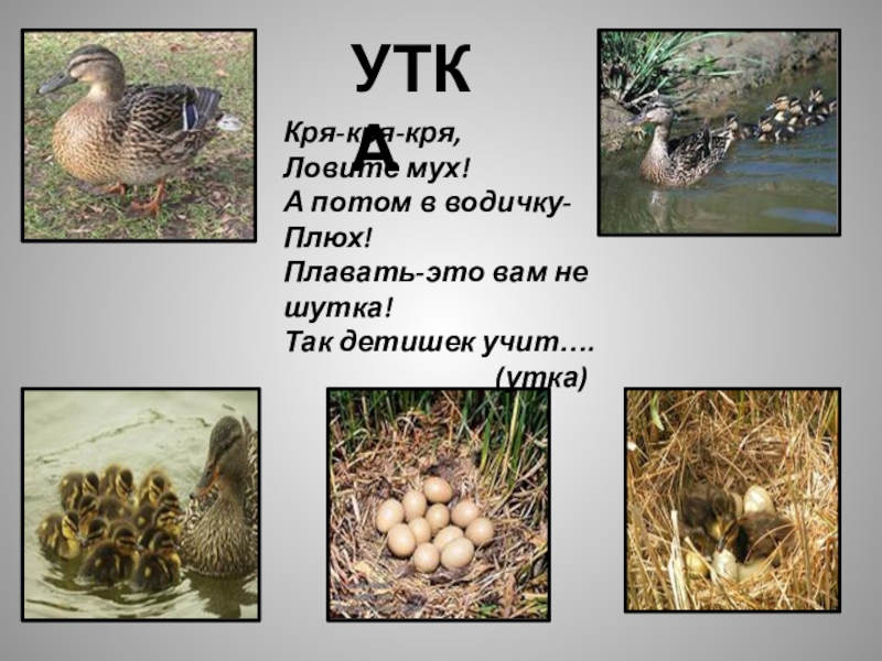 УТКАКря-кря-кря,Ловите мух!А потом в водичку-Плюх!Плавать-это вам не шутка!Так детишек учит….