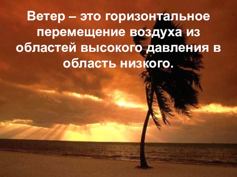 Слайд 2Ветер – это горизонтальное перемещение воздуха из областей высокого давления в