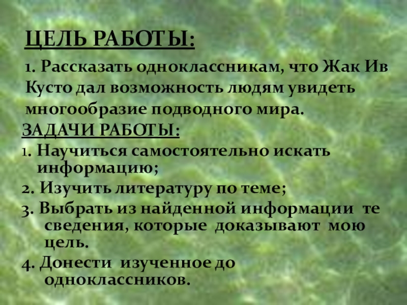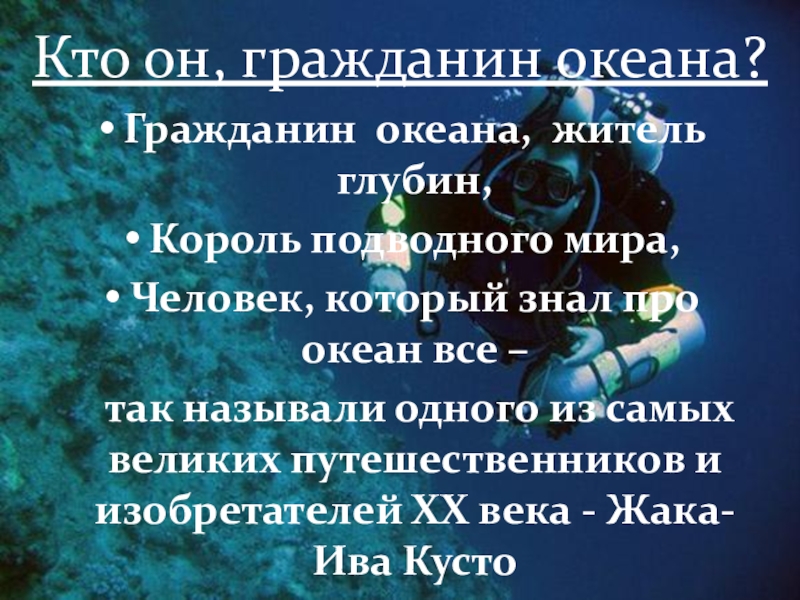 1. Рассказать одноклассникам, что Жак Ив Кусто дал возможность людям увидеть многообразие подводного мира.