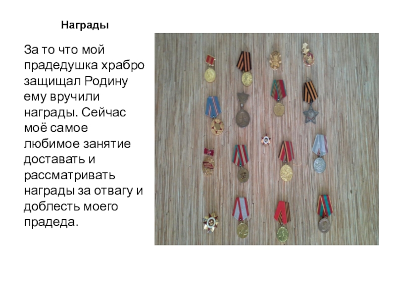 НаградыЗа то что мой прадедушка храбро защищал Родину ему вручили награды. Сейчас моё самое любимое занятие доставать