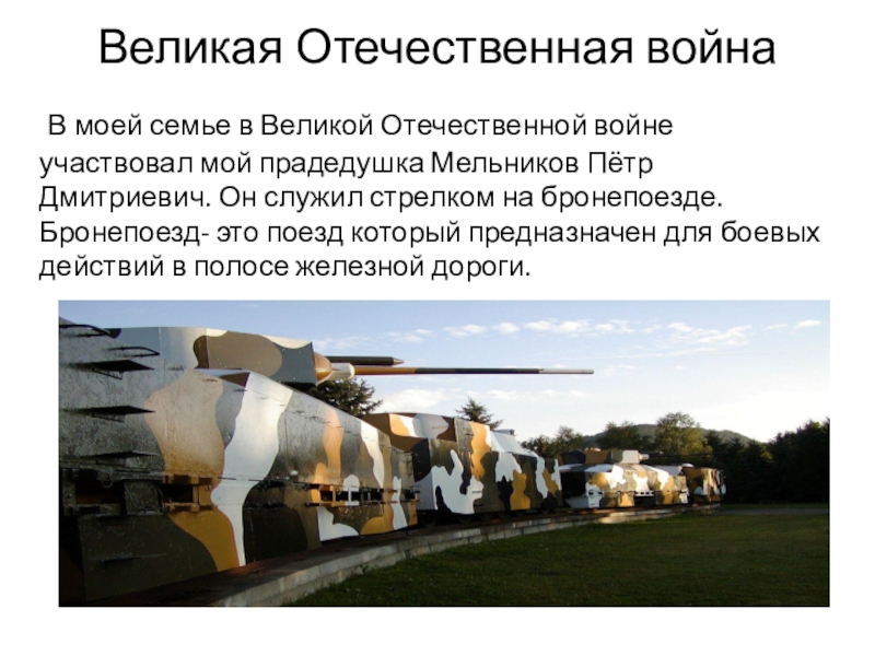Великая Отечественная война В моей семье в Великой Отечественной войне участвовал мой прадедушка Мельников Пётр Дмитриевич. Он служил стрелком на бронепоезде. Бронепоезд- это поезд который предназначен для боевых действий в полосе железной дороги.
