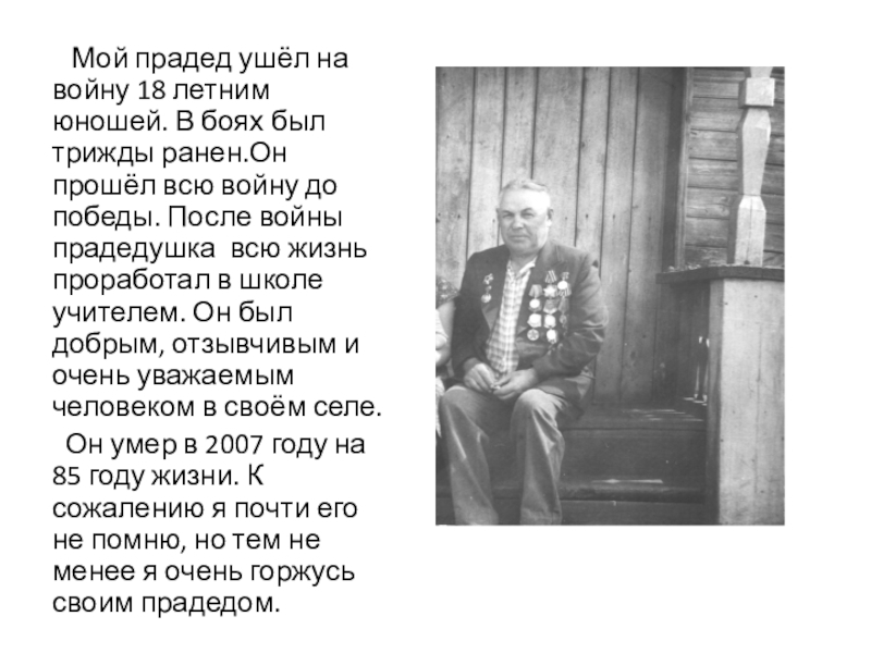 Слайд 7 Мой прадед ушёл на войну 18 летним юношей. В