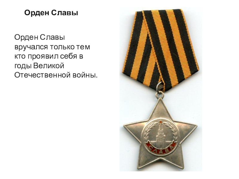 Орден СлавыОрден Славы вручался только тем кто проявил себя в годы Великой Отечественной войны.
