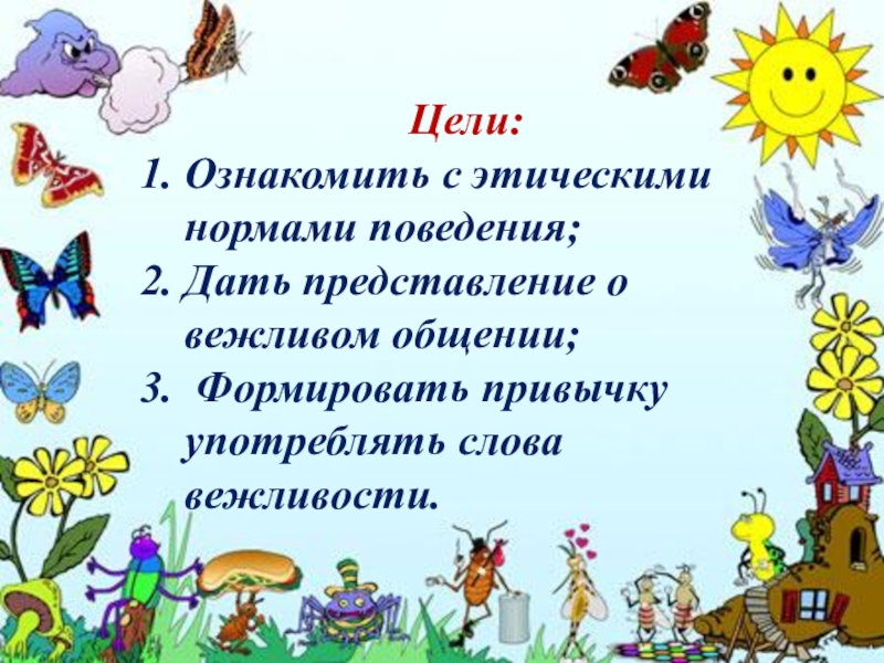 Цели:Ознакомить с этическими нормами поведения; Дать представление о вежливом общении; Формировать привычку употреблять слова вежливости.