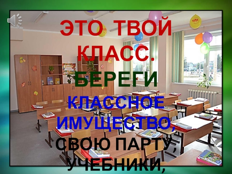 ЭТО ТВОЙ КЛАСС.БЕРЕГИ КЛАССНОЕ ИМУЩЕСТВО,СВОЮ ПАРТУ, УЧЕБНИКИ,СОДЕРЖИ КЛАССВ ЧИСТОТЕ…