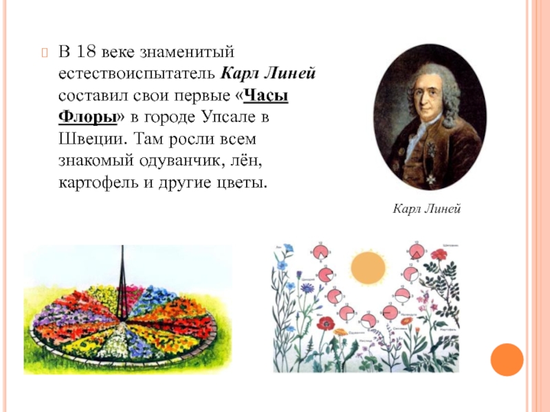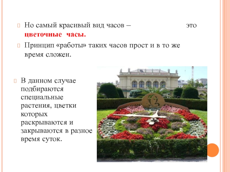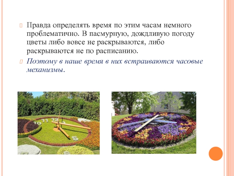 В данном случае подбираются специальные растения, цветки которых раскрываются и закрываются в разное время суток.