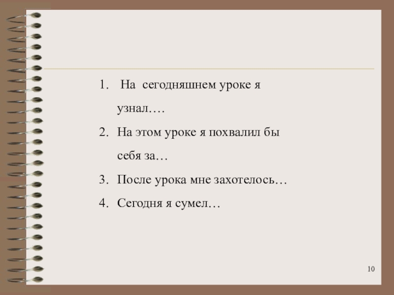 На сегодняшнем уроке я узнал….На этом уроке я похвалил бы себя за…После урока мне захотелось…Сегодня я